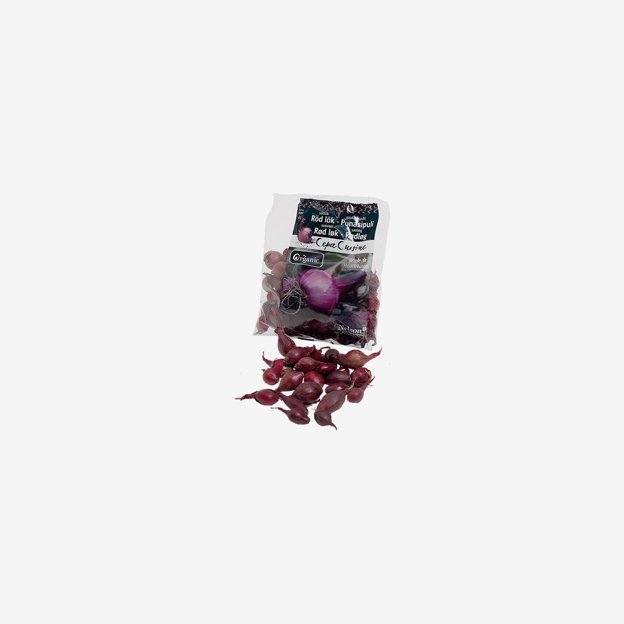 Ekologiskt odlad sättlök. Rödlök är lättodlad och något mildare i smaken än gul lök. Den passar därför utmärkt rå i t.ex. sallader, där den också är mycket dekorativ. Värmebehandlad för säkrare skörd.