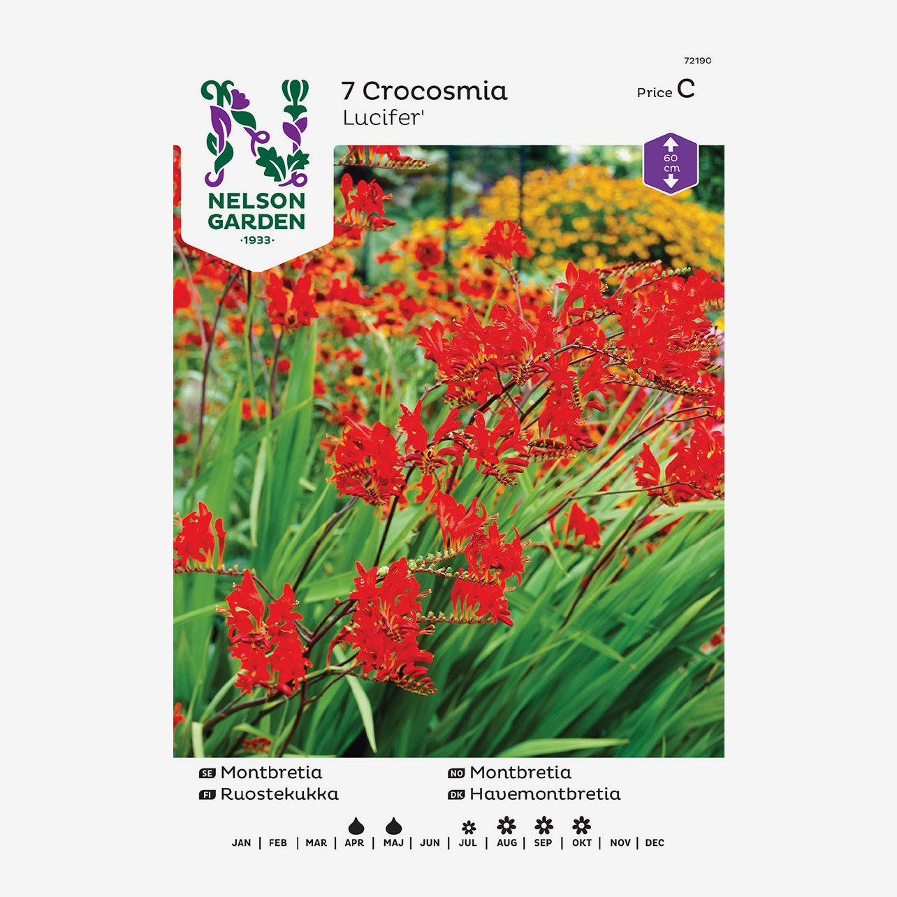 Kallas även Montbretia och höstlilja. Mycket vacker växt med exotiskt utseende. Rödorange blommor utmed 60 cm höga, bågböjda stänglar på sensommaren. Till blandade rabatter med god trädgårdsjord. Väldigt fin i buketter.