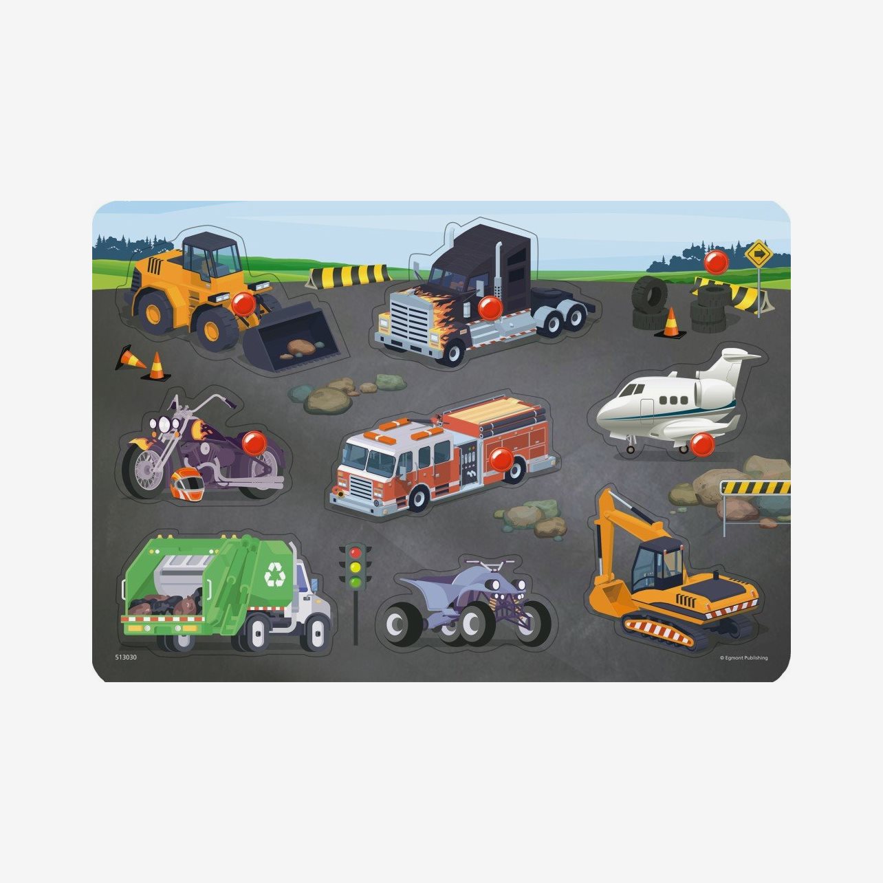 Ett första pussel för de allra minsta barnen. Detta knoppussel har åtta bitar med motiv av olika fordon.
