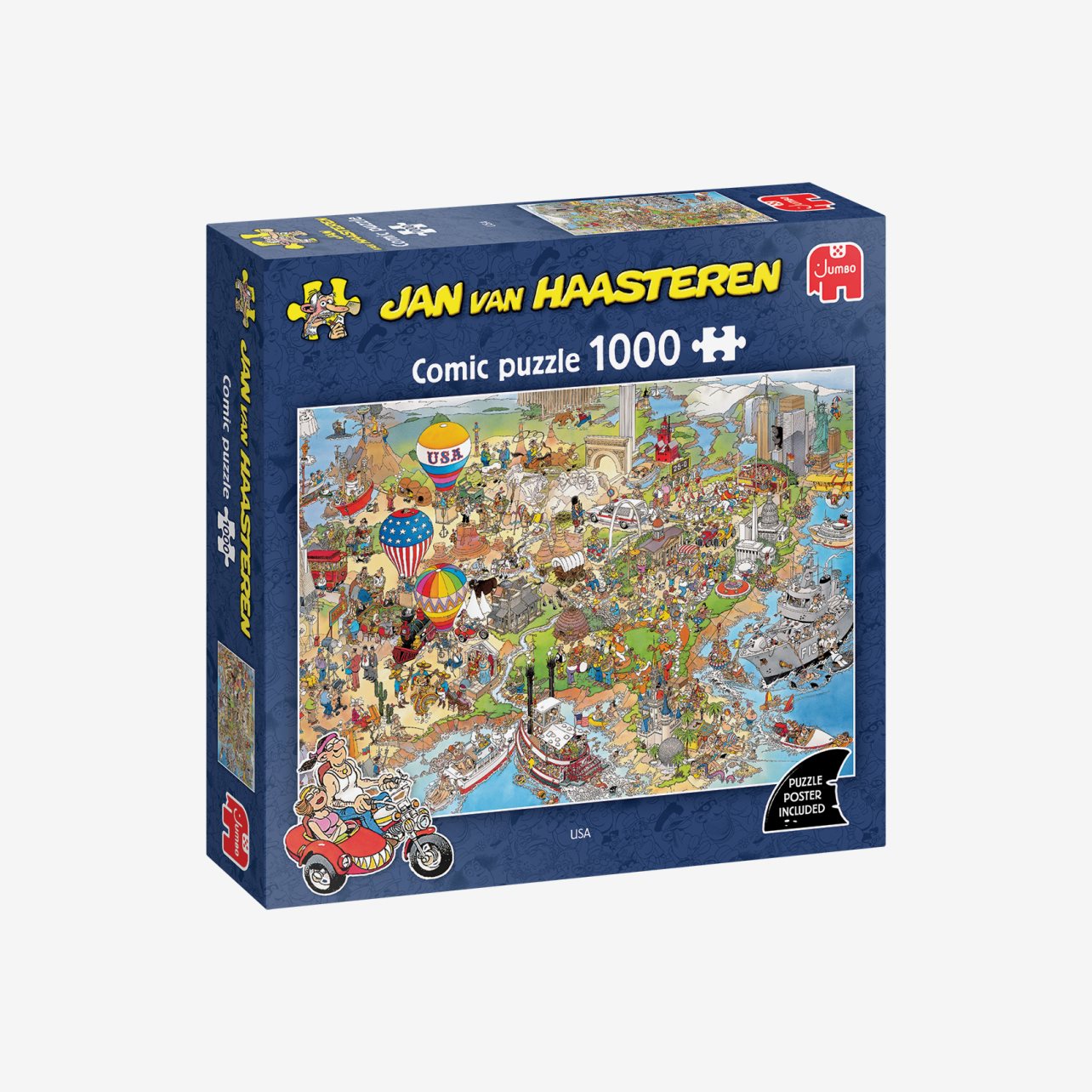 En överblick över USA. Ett roligt pusselmotiv för alla oss som gillar att lägga pussel. Detta motiv är målat av Jan van Haasteren. Det är på 1000 bitar och blir ca 68 x 48 cm när det är klart.