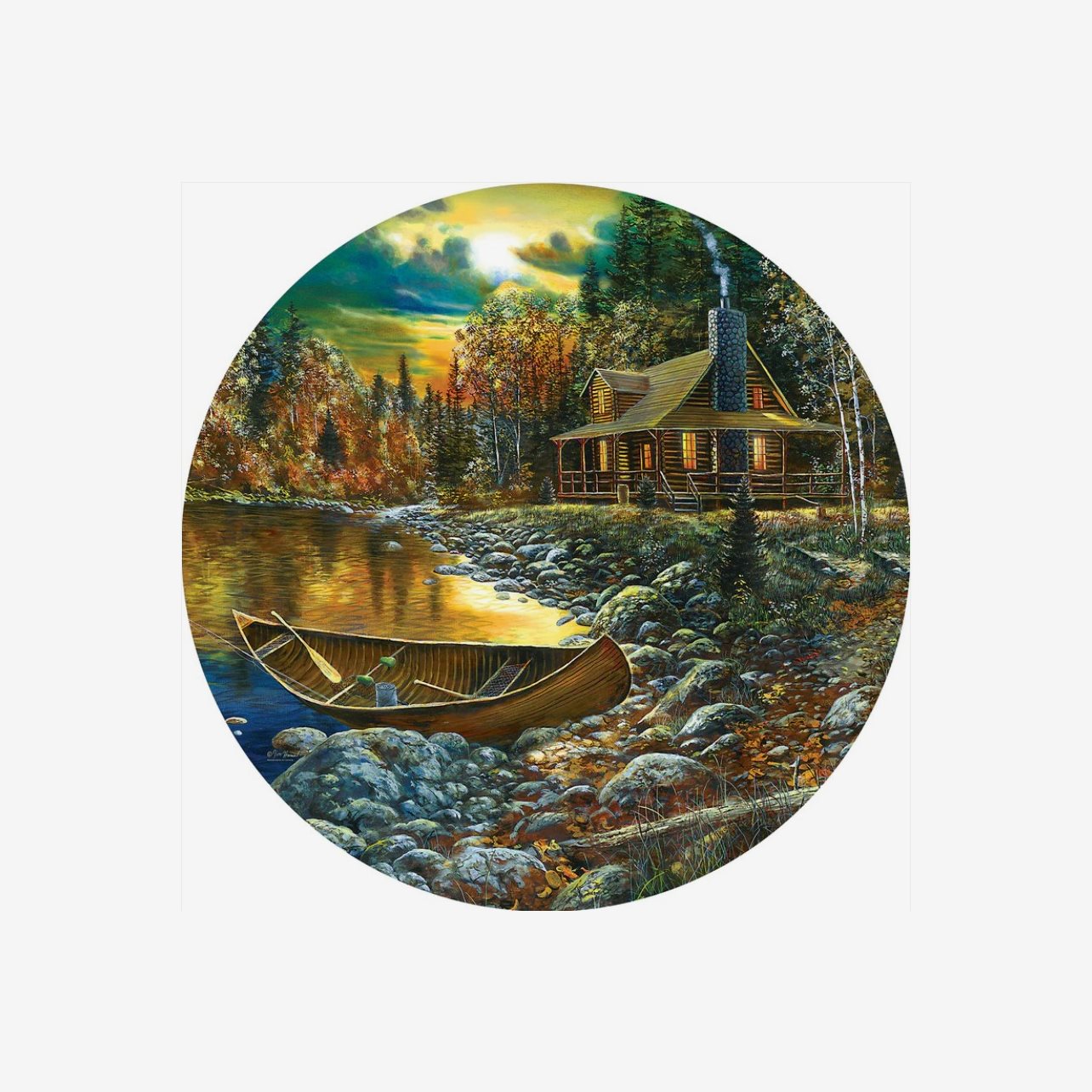 Vackert runt pussel med motiv av en stuga vid sjön under hösten.